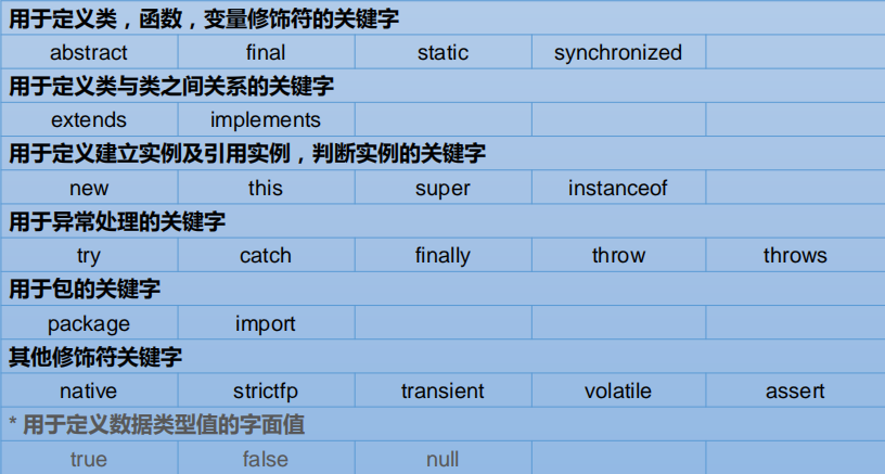 - 定义:被Java语言赋予了特殊含义,用做专门用途的字符串(单词)。