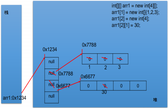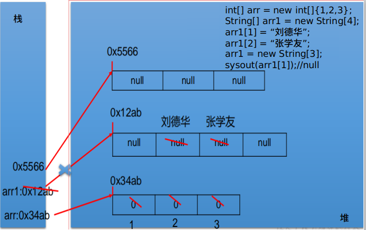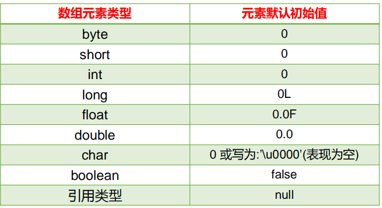 - 对于引用数据类型而言,默认初始化值为null(注意与0不同!)