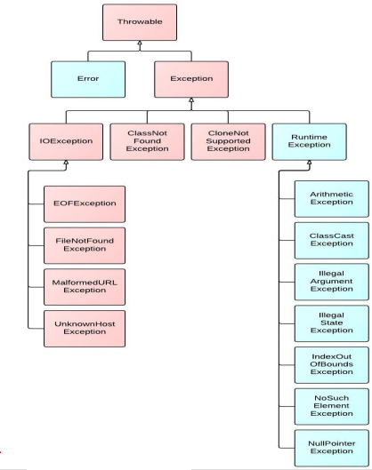- Exception: 其它因编程错误或偶然的外在因素导致的一般性问题,可以使用针对性的代码进行处理。例如:空指针访问、试图读取不存在的文件、网络连接、数组角标越界等。