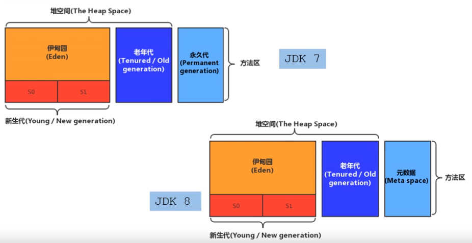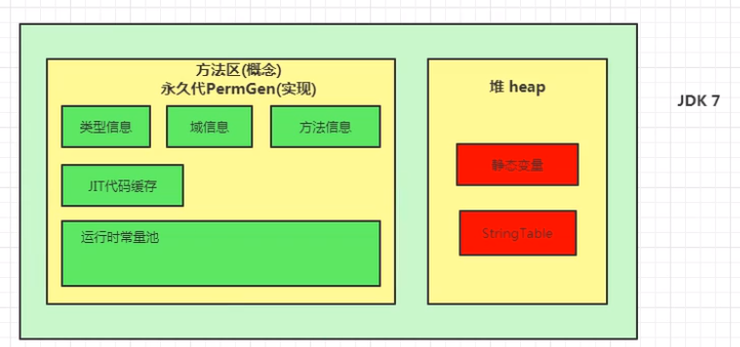 - jdk1.7:有永久代,但已经逐步“去永久代”,字符串常量池、静态变量移除,保存在堆中。