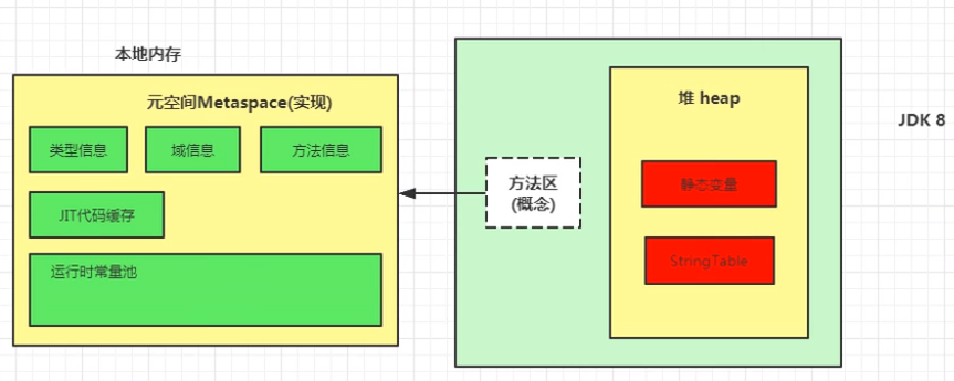 - jdk8及以后:无永久代,类型信息、字段、方法、常量保存在本地内存的元空间,但字符串常量池、静态变量仍然在堆。