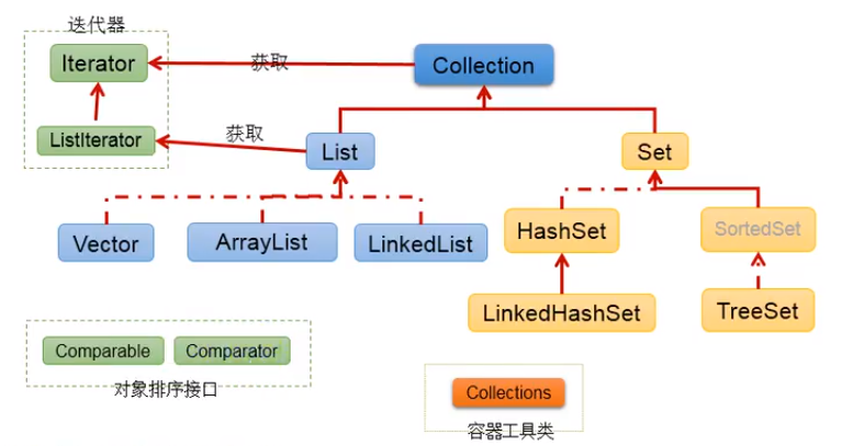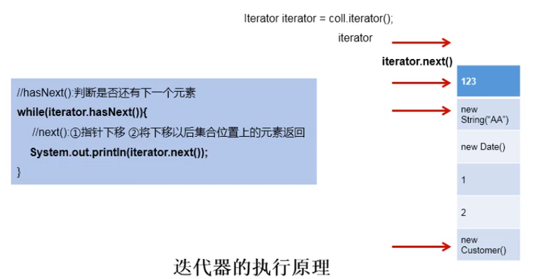 - 集合对象每次调用iterator()方法都得到一个全新的迭代器对象,默认游标都在集合的第一个元素之前。