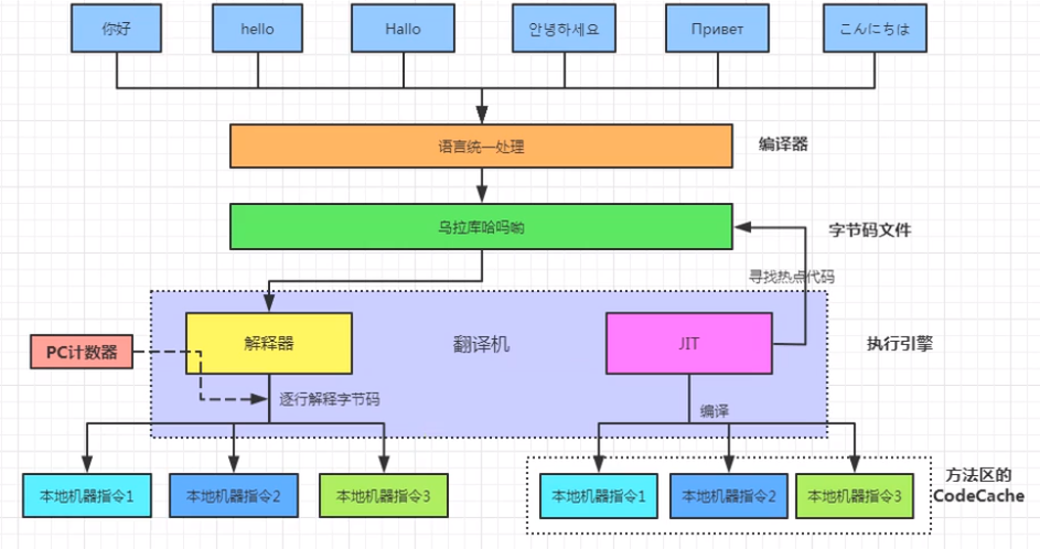- 当JVM发现某个方法或代码块运行特别频繁时,就会把这些代码认定为“热点代码(Hot Spot Code)”,然后JVM会把这些代码编译成与本地平台相关的机器码,并进行各种层次的优化,完成这个任务的编译器称为:即时编译器(Just In Time Compiler,JIT)。