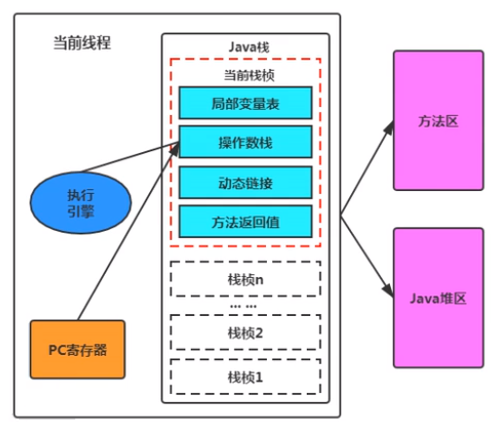 - 方法在执行的过程中,执行引擎有可能会通过存储在局部变量表中的对象引用准确定位到存储在Java堆区中的对象实例信息,以及通过对象头中的元数据指针定位到目标对象的类型信息。