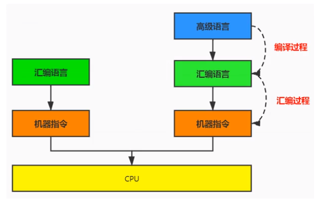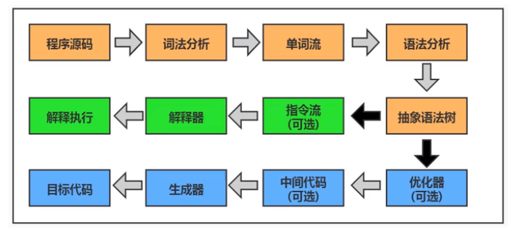 - 输入的代码 -> [ 编译器 编译 ] -> 编译后的代码 -> [ 执行 ] -> 执行结果。