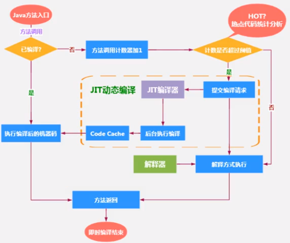 - 是否需要启动 JIT 编译器将字节码直接编译为对应平台的本地机器指令,则需要根据代码被调用执行的频率而定。关于那些需要被编译为本地代码的字节码,也被称之为“热点代码” , JIT编译器在运行时会针对那些频繁被调用的“热点代码”做出深度优化,将其直接编译为对应平台的本地机器指令,以此提升 Java 程序的执行性能。