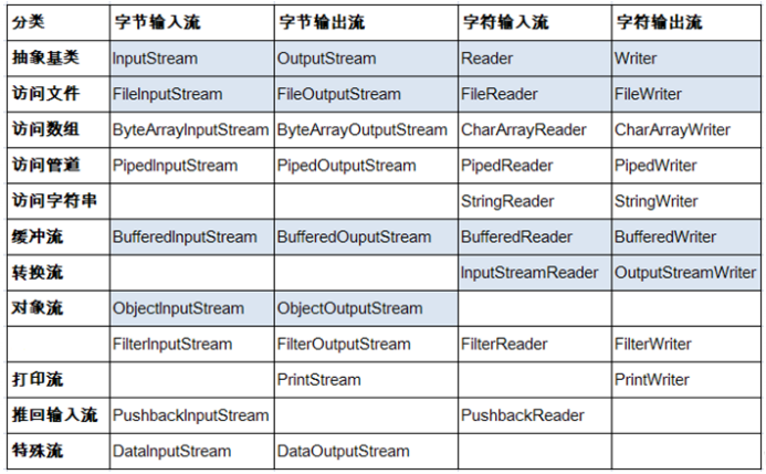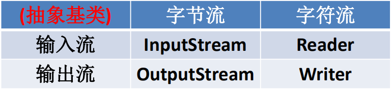 | OutputStream | FileOutputStream (write(byte[] buffer,0,len) | BufferedOutputStream (write(byte[] buffer,0,len) / flush() |