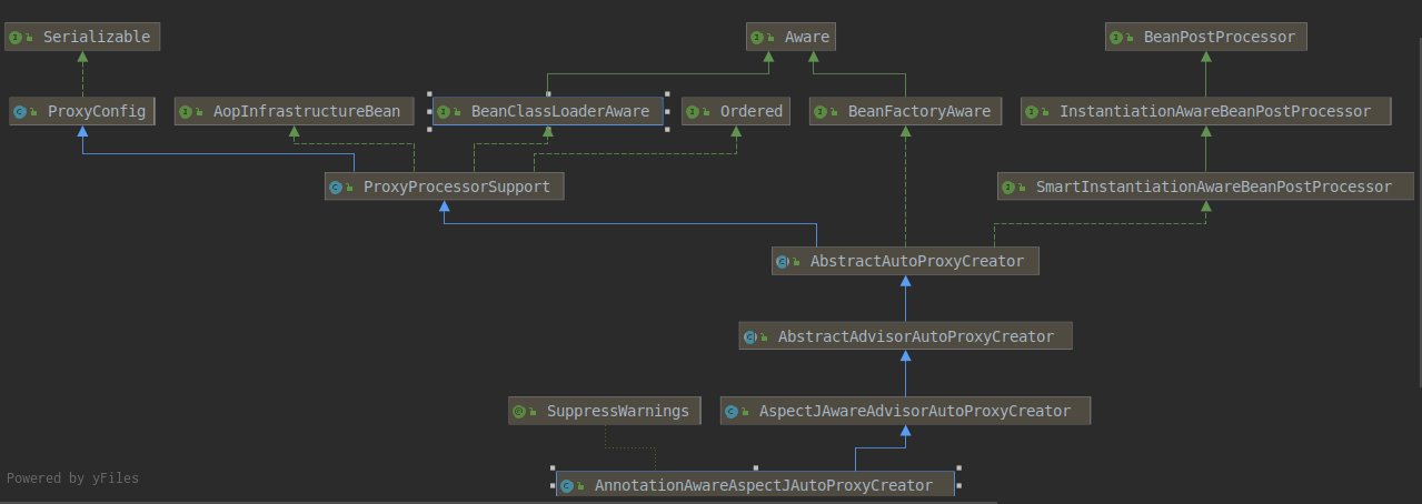 }AnnotationAwareAspectJAutoProxyCreator类的继承树如下图,这里主要关注后置处理器SmartInstantiationAwareBeanPostProcessor和自动装备Bean工厂BeanFactoryAware相关的方法。