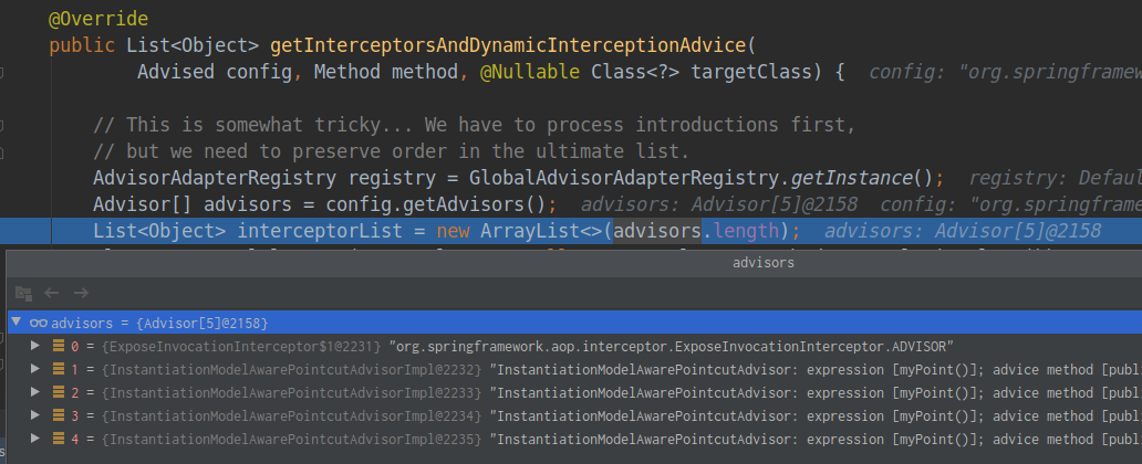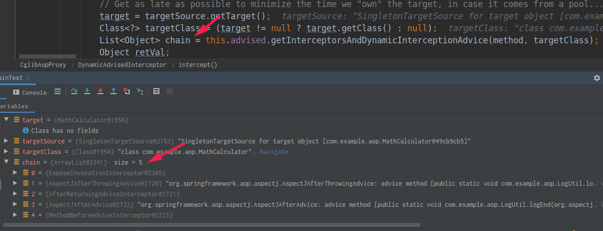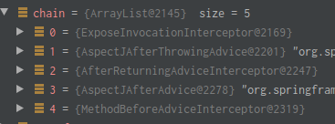+ ①链式获取每一个拦截器,拦截器执行invoke方法,每一个拦截器等待下一个拦截器执行完成返回以后再来执行(递归调用),**拦截器链的机制,保证通知方法与目标方法的执行顺序**。五个拦截器的信息如下: