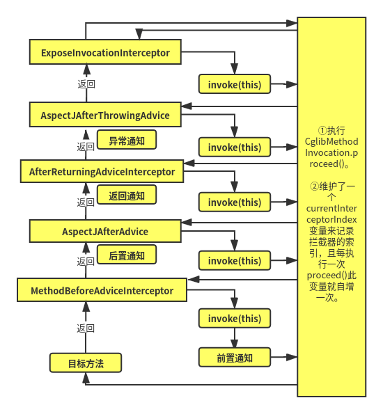 ③如果有拦截器链则把需要执行的目标对象,目标方法,拦截器链等信息传入并创建一个CglibMethodInvocation对象,最后调用其proceed()方法。