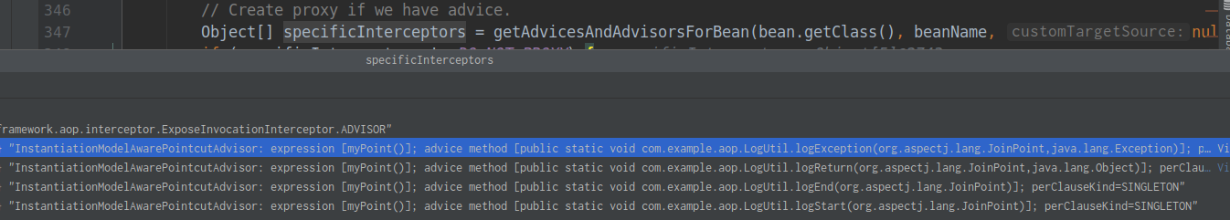 首先AnnotationAwareAspectJAutoProxyCreator继承了AbstractAutoProxyCreator实现了BeanFactoryAware接口,所以在创建AnnotationAwareAspectJAutoProxyCreatorBean的过程中初始化方法里面会调用setBeanFactory方法,在setBeanFactory方法里面调用initBeanFactory来初始化通知者检索帮助类,后面检索通知会用到。