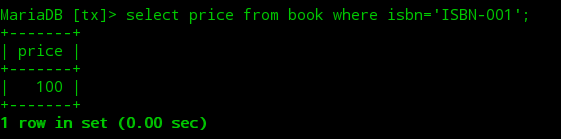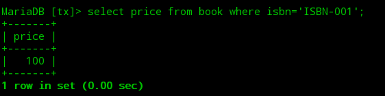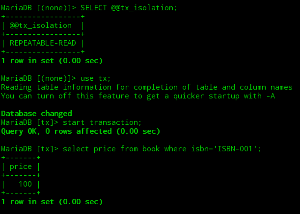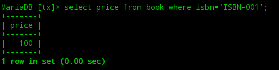 ①打开第一个终端,开启一个mysql会话,此时默认的隔离级别为可重复读,接着开启一个事务查询到图书表中ISBN-001图书的初始价格为100。