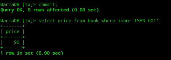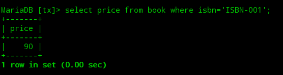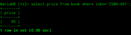 ②打开第二个终端,开启一个mysql会话并开启一个事务将图书表中ISBN-001图书的价格更改为90,此时当前事务并未提交。