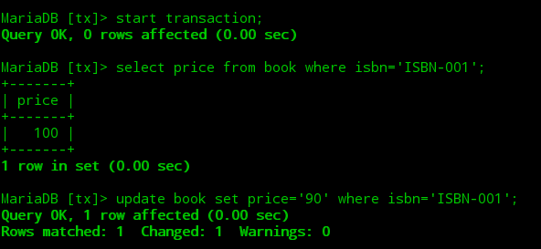 ①打开第一个终端,开启一个mysql会话,接着开启一个事务查询到图书表中ISBN-001图书的初始价格为100,紧接着修改价格为90。