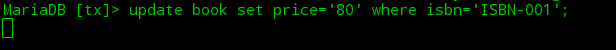②打开第二个终端,开启一个mysql会话并将图书表中ISBN-001图书的价格更改为80,此时由于第一个终端中修改同一条数据的事务并未提交,所以排队进行等待。