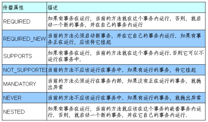 ⑧Propagation propagation() default Propagation.REQUIRED:事务的传播行为,即当事务方法被另一个事务方法调用时,必须指定事务应该如何传播。例如:方法可能继续在现有事务中运行,也可能开启一个新事务,并在自己的事务中运行。Spring定义了7种类传播行为: