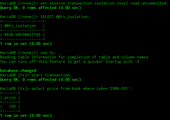 ①打开第一个终端,开启一个mysql会话并修改当前会话的隔离级别为“读未提交”,接着开启一个事务查询到图书表中ISBN-001图书的初始价格为100。