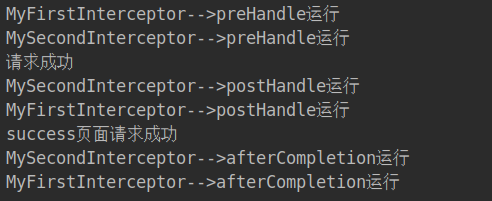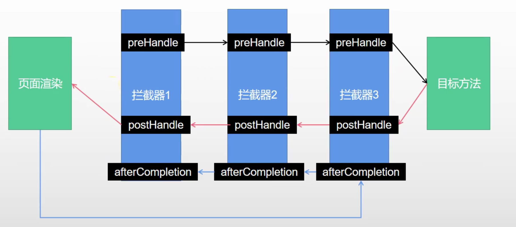 - ③多个拦截器的preHandle方法的顺序是按照拦截器的配置顺序执行的,而postHandle和afterCompletion方法是逆序执行的。