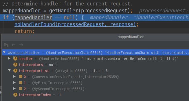 }①运行getHandler(processedRequest)方法获取到该请求对应的处理器,里面包含了三个拦截器信息(两个是自定义的,一个是默认的拦截器):