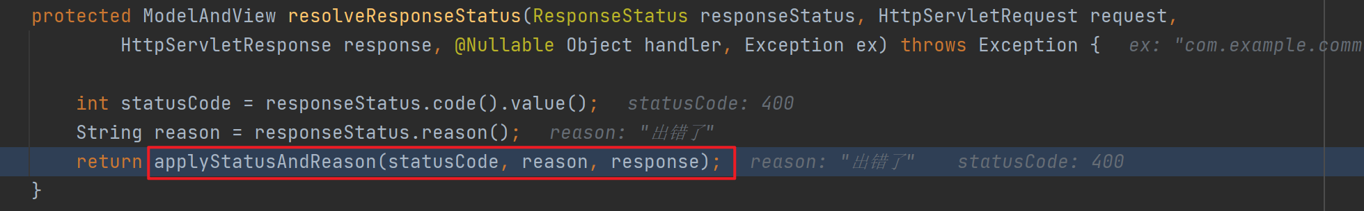 ②如果是基于@ResponseStatus注解的异常处理方式,则是使用ResponseStatusExceptionResolver来处理的,它会在doResolveException()中判断当前抛出的异常是否标了@ResponseStatus注解,如果是则通过接连调用resolveResponseStatus()–>applyStatusAndReason()–>response.sendError()使此次请求立即结束并转发出/error请求将错误信息发给tomcat来响应错误页面,最后创建一个空的ModelAndView对象后返回。