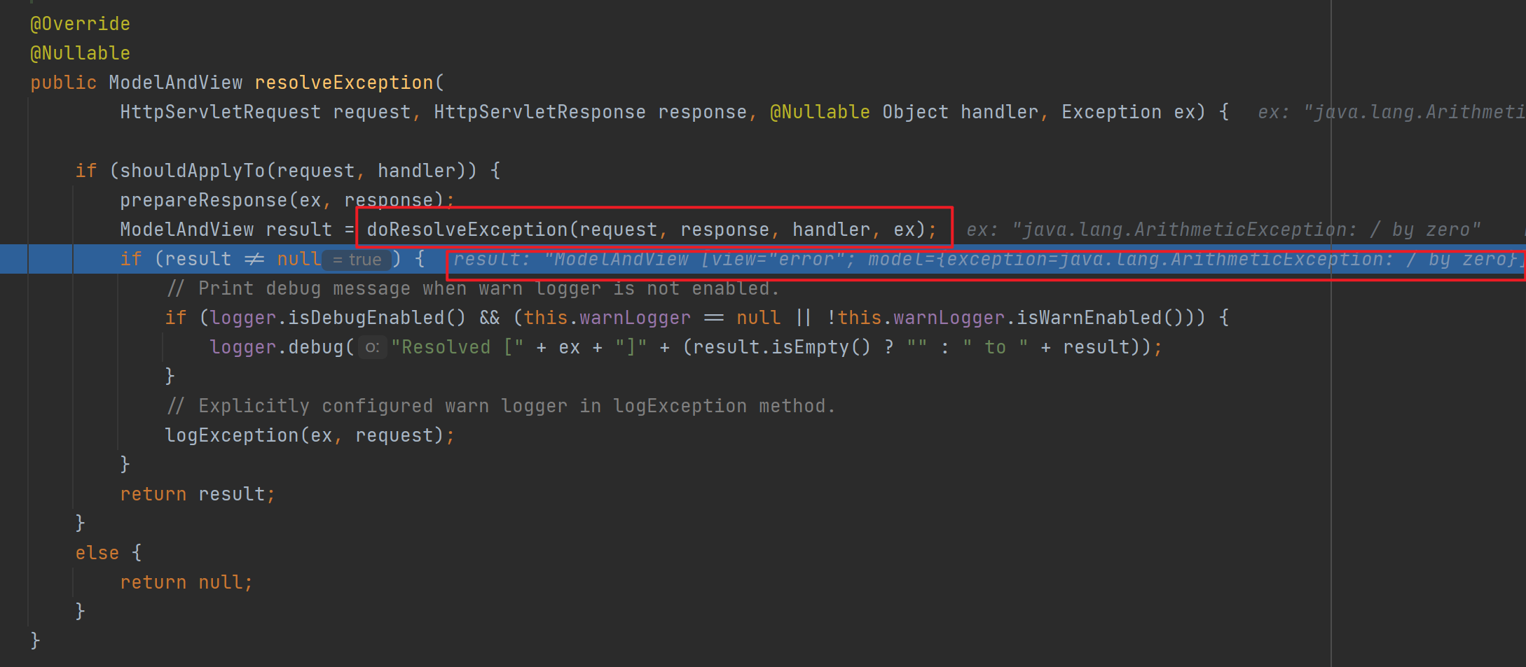 }现在在DispatcherServlet类的doDispatch方法的processDispatchResult方法处打上断点,运行项目后访问有异常的接口后来到此方法,调用此方法时会传入不为null的Exception而导致会调用processHandlerException进入到处理异常的逻辑: