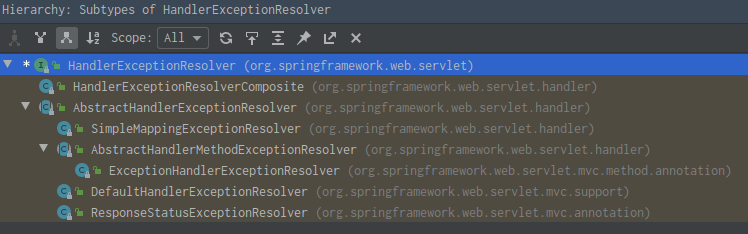 }其中的handlerExceptionResolvers即为初始化后的默认的三个异常处理器: