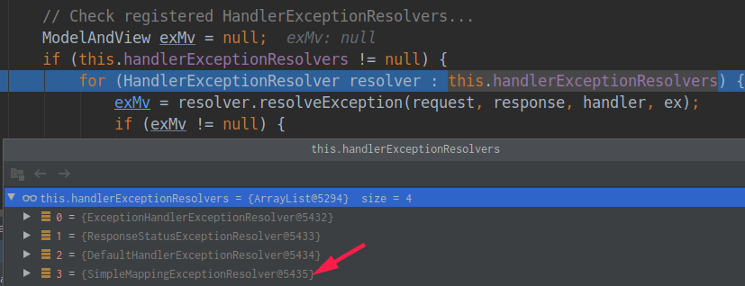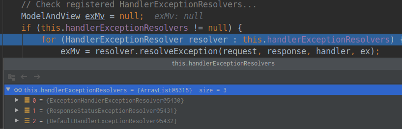 for (HandlerExceptionResolver resolver : this.handlerExceptionResolvers) {