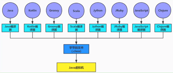 - 所有的JVM全部遵守]ava虚拟机规范,也就是说所有的JVM环境都是一样的,这样一来字节码文件可以在各种JVM上运行。