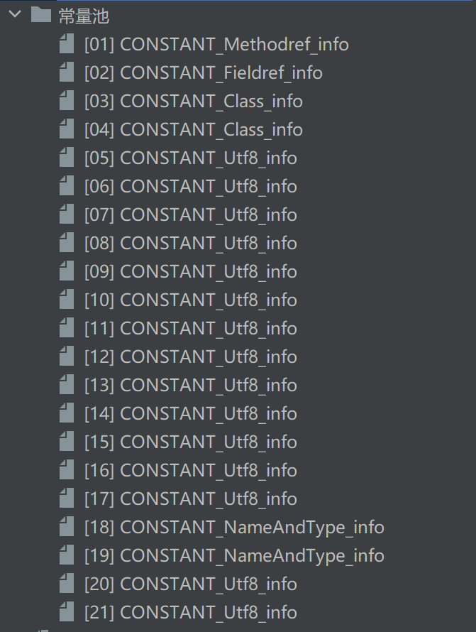 它包含了class文件结构及其子结构中引用的所有字符串常量、类或接口名、字段名和其他常量。常量池中的每一项都具备相同的特征。第1个字节作为类型标记,用于确定该项的格式,这个字节称为tag byte(标记字节、标签字节)。