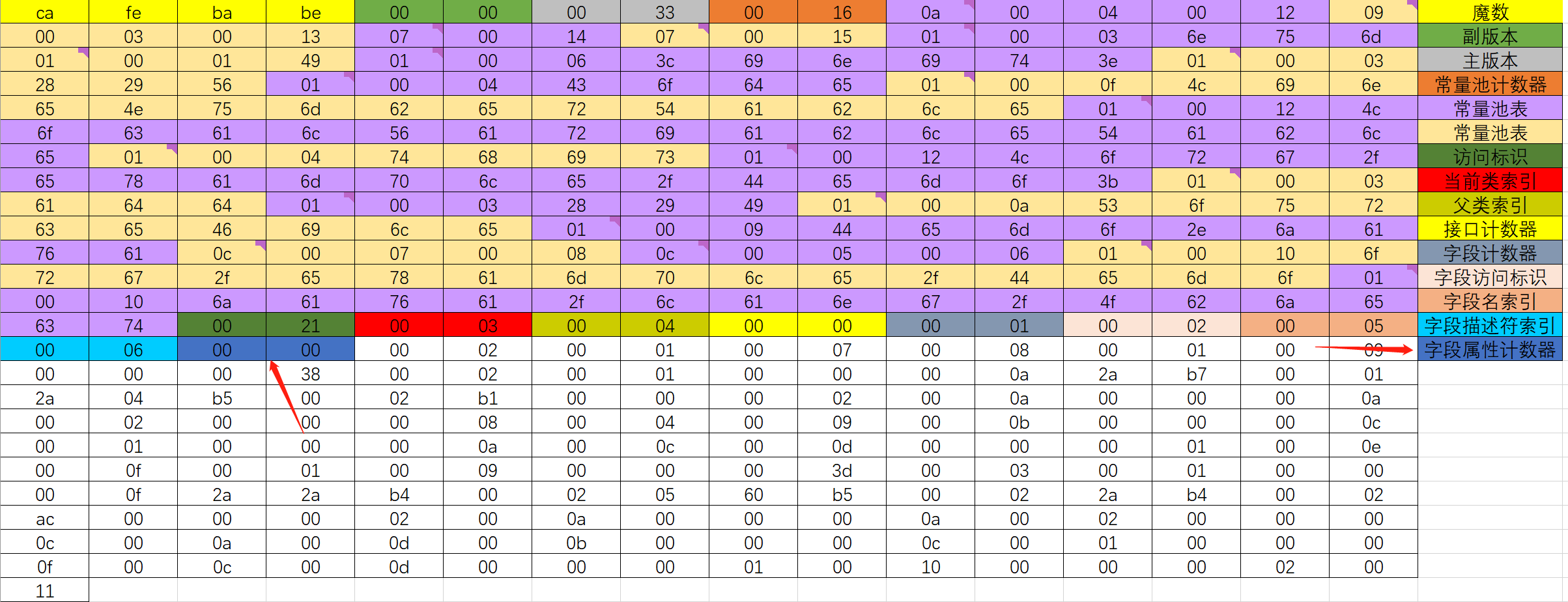 - 字段计数器(fields_count)的值表示当前class文件flelds表的成员个数。使用两个字节来表示。