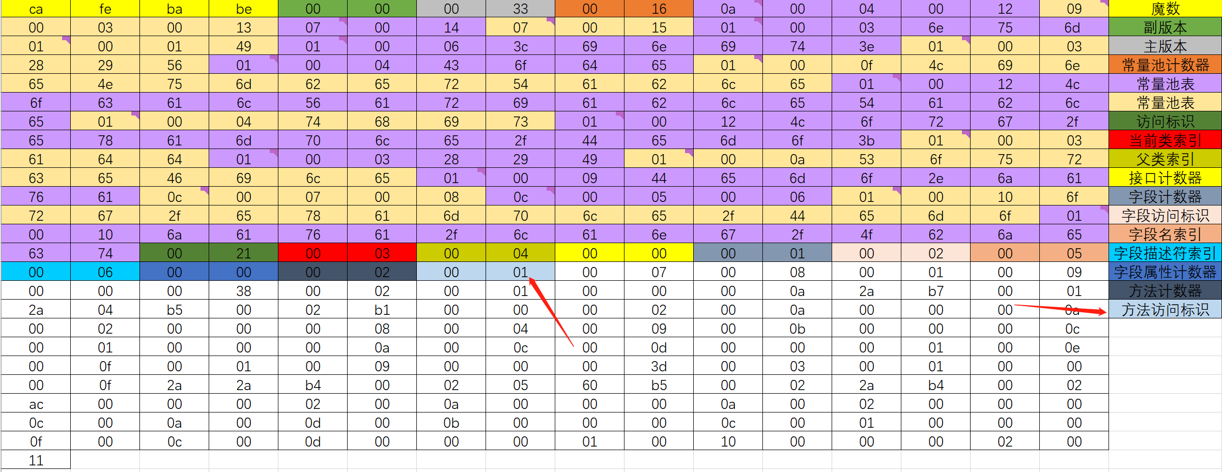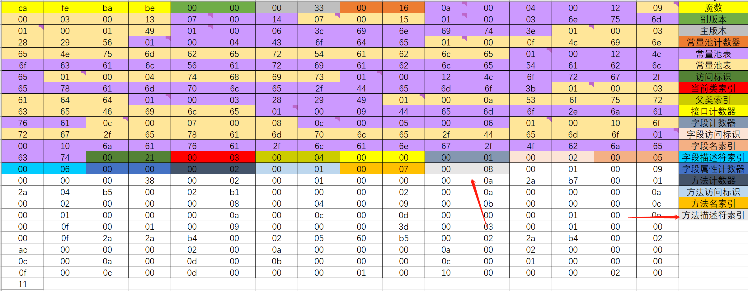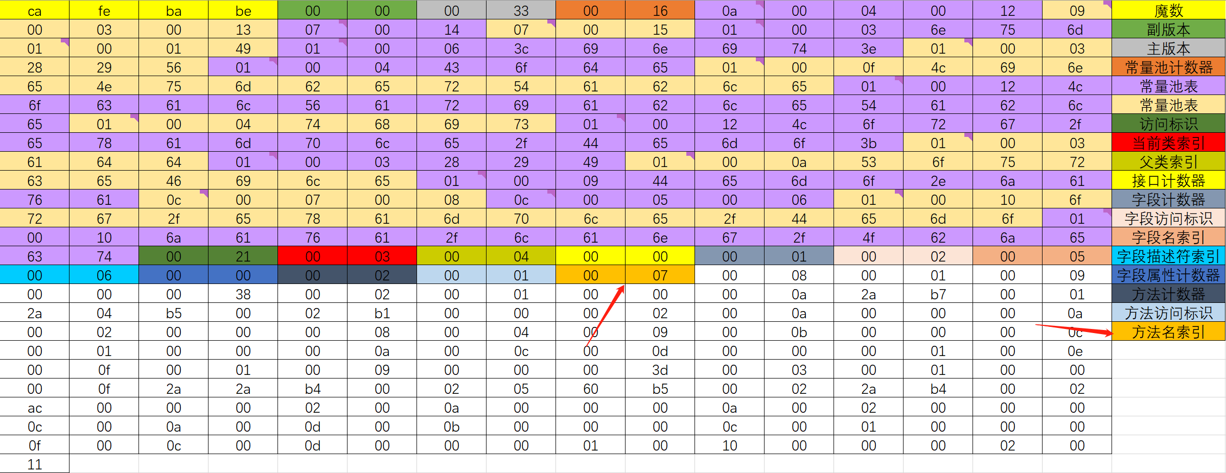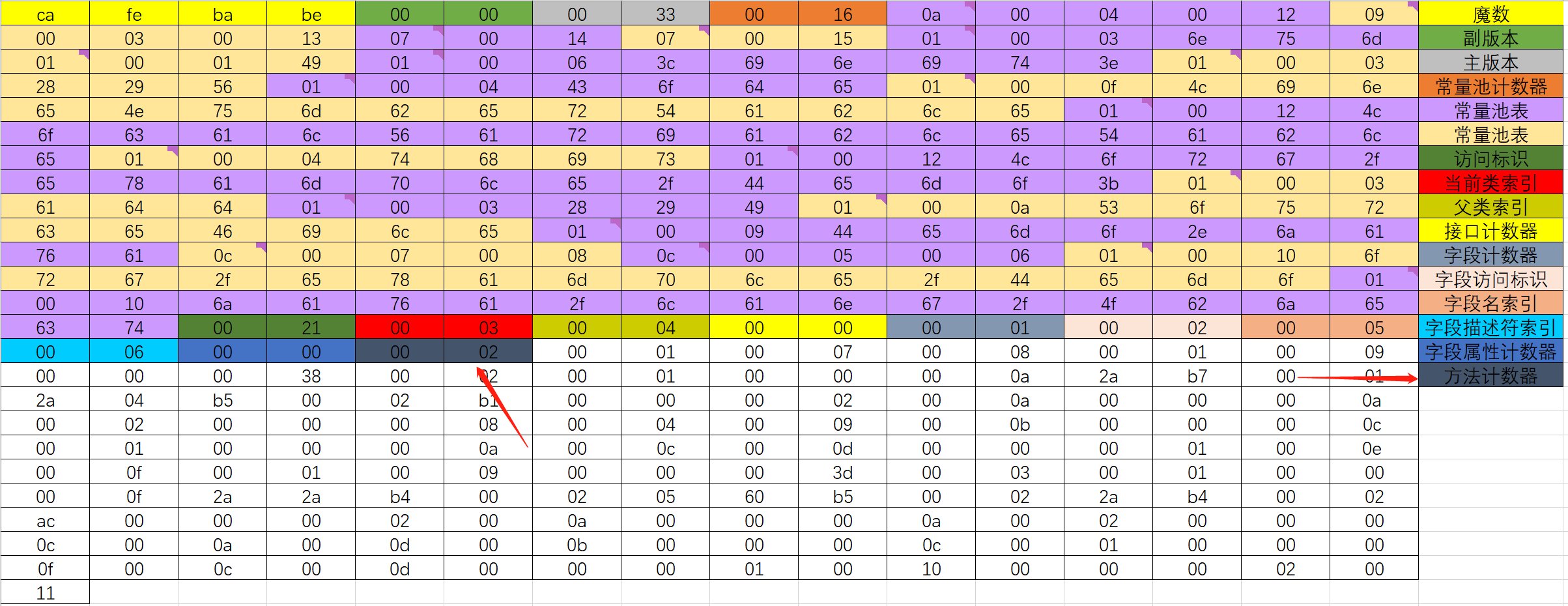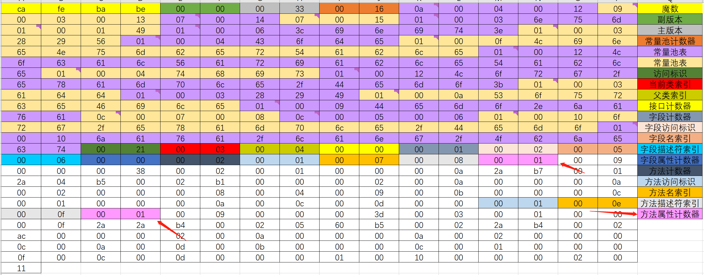 - 一方面,methods表只描述当前类或接口中声明的方法,不包括从父类或父接口继承的方法。另一方面,methods表有可能会出现由编译器自动添加的方法,最典型的便是编译器产生的方法信息(比如:类(接口)初始化方法