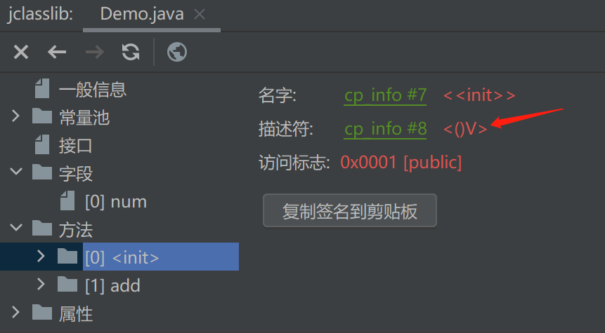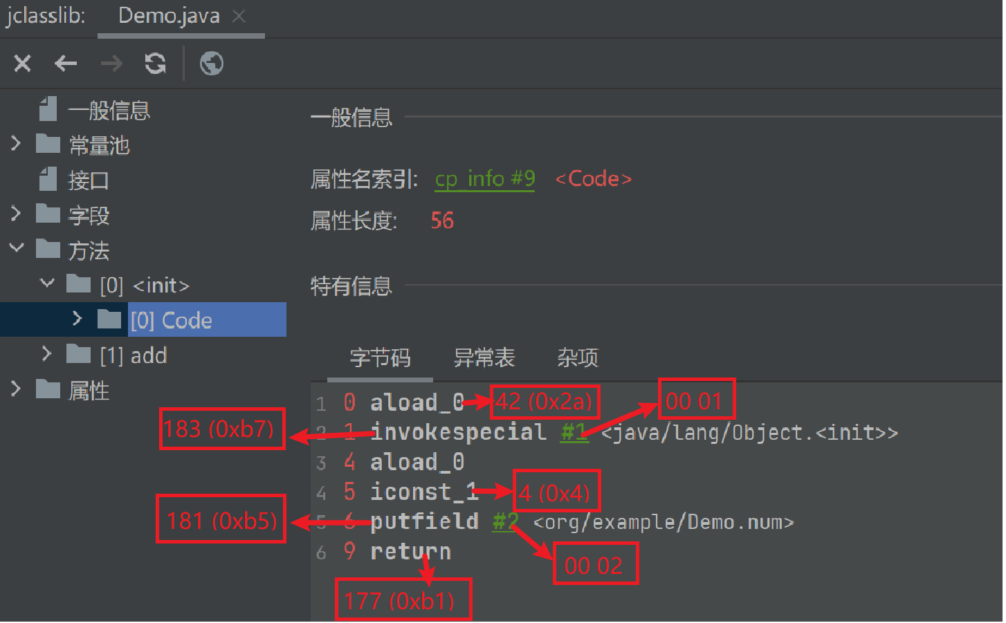 在字节码指令中标出两个方法(构造方法和add方法)的对应信息: