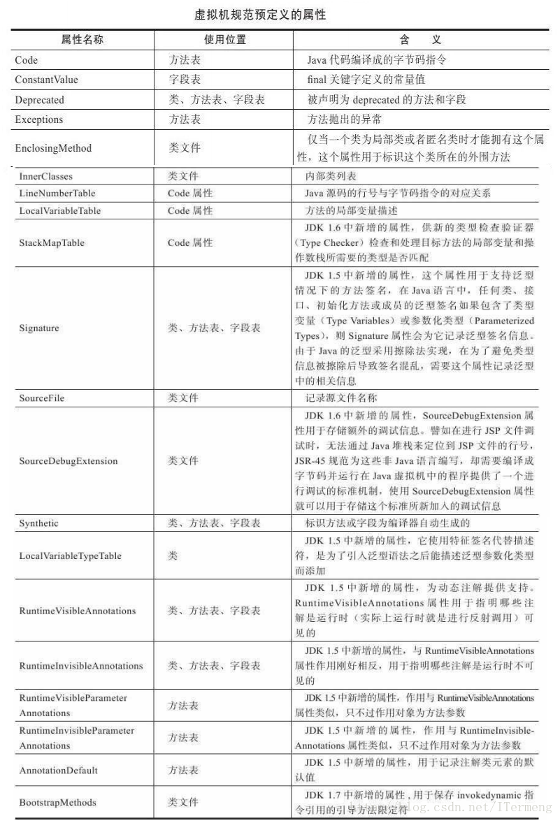 - 属性表集合的限制没有那么严格,不再要求各个属性表具有严格的顺序,并且只要不与已有的属性名重复,任何人实现的编译器都可以向属性表中写入自己定义的属性信息,但Java虚拟机运行时会忽略掉它不认识的属性。