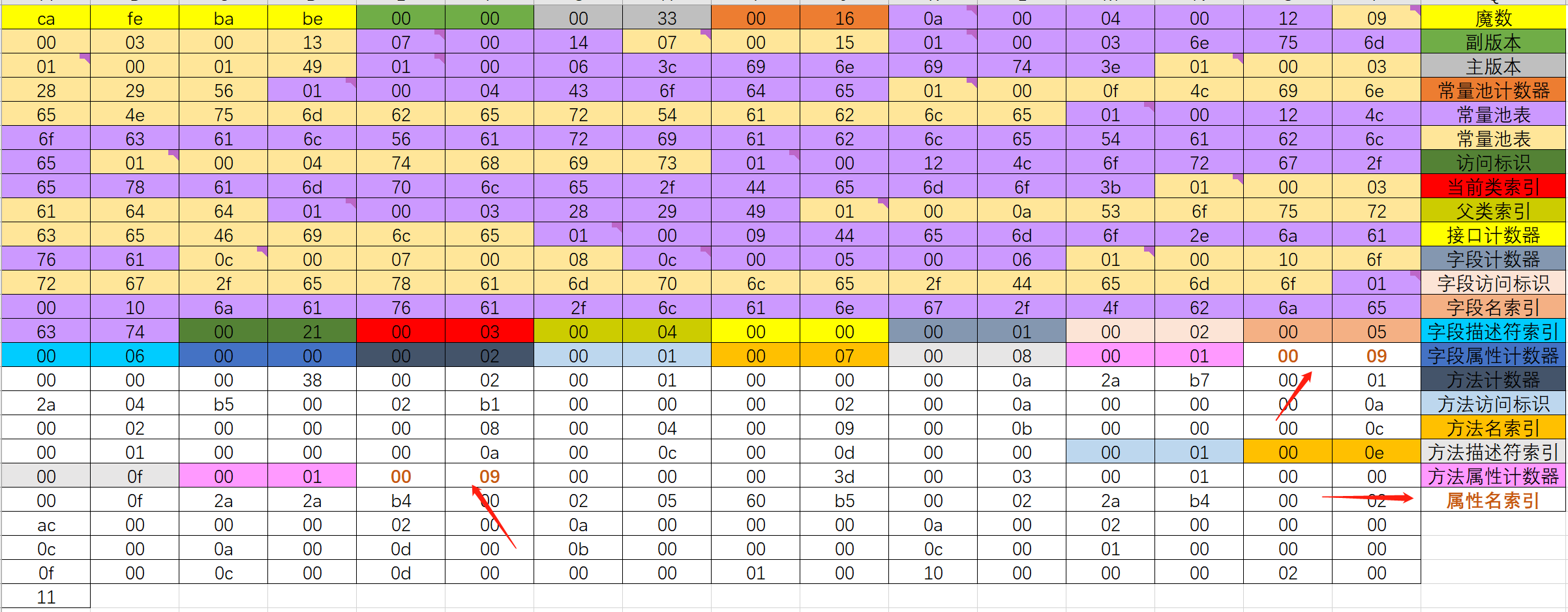 以方法表中的属性表为例,找到两个方法中各自的属性名索引都为09,即为Code属性。属性表实际上可以有很多类型,Code属性只是其中一种,Java8里面定义了23种属性。