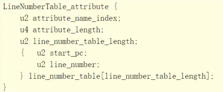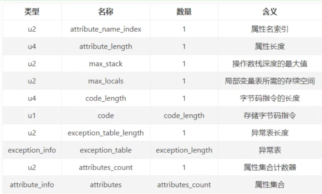- attributes_count的值表示当前class文件属性表的成员个数。属性表中每一项都是一个attribute_info结构。这里以方法表中的属性计数器为例: