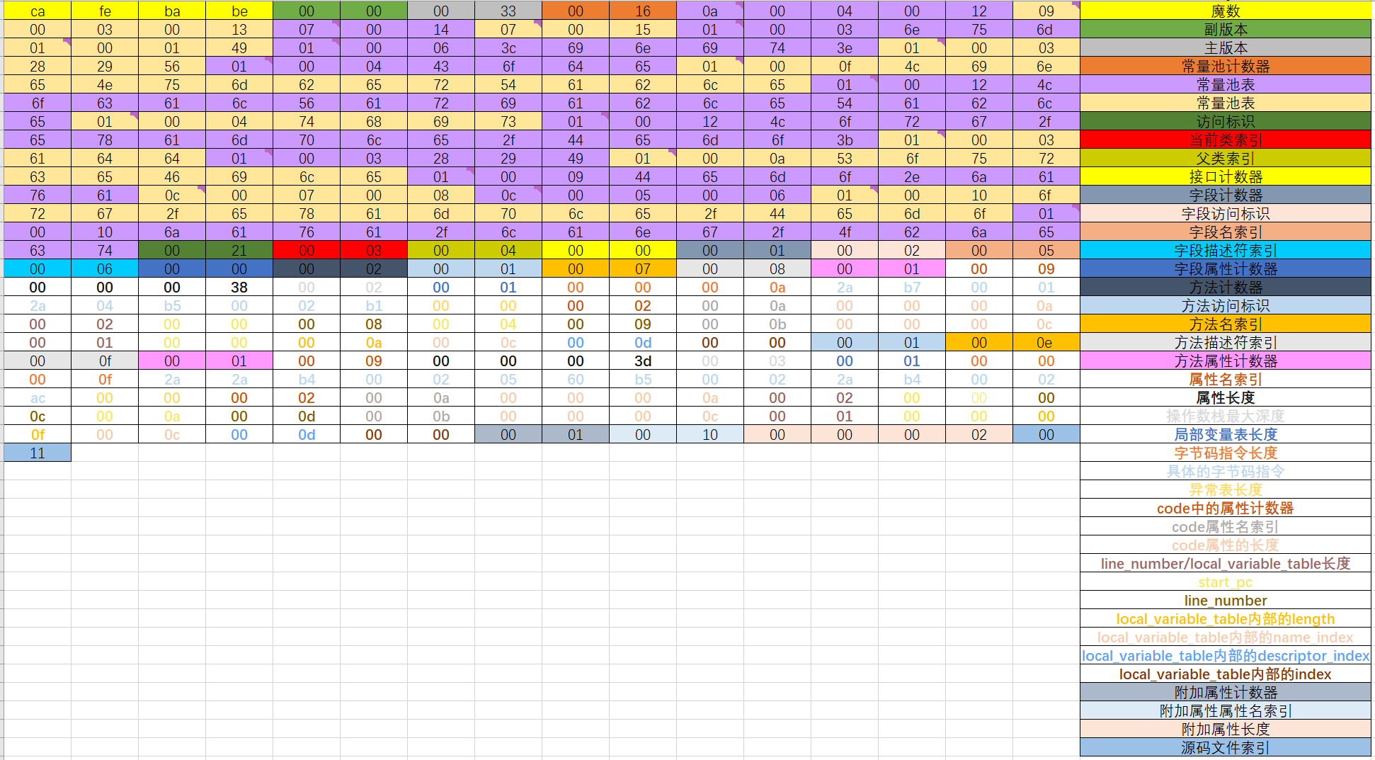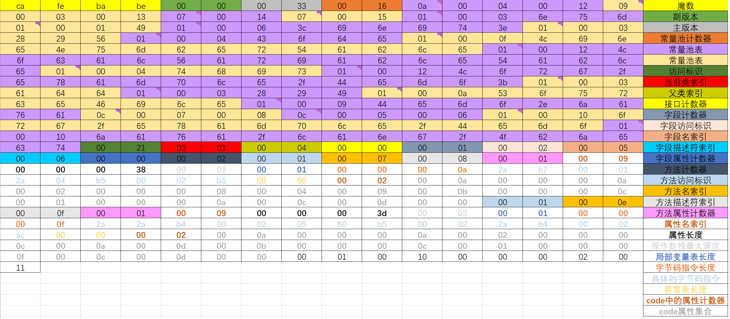 **Class文件格式:**Class的结构不像xml等描述语言,由于它没有任何分隔符号。所以在其中的数据项,无论是字节顺序还是数量,都是被严格限定的,哪个字节代表什么含义,长度是多少,先后顺序如何,都不允许改变。