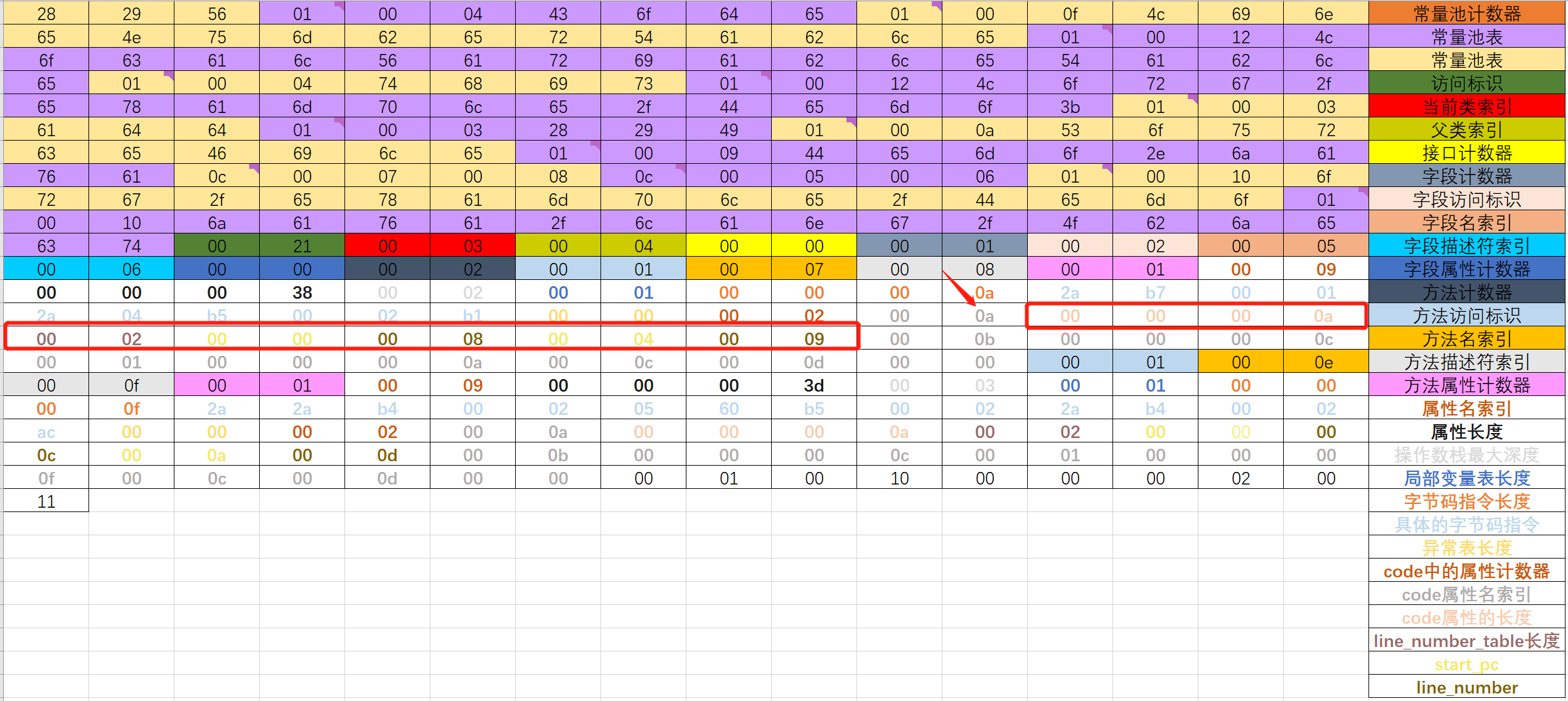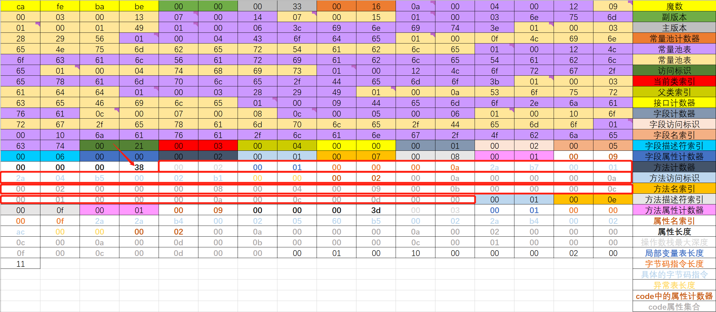 其中,以第一个方法(构造方法为例),它的属性长度是00 00 00 38,转换为十进制即为56,即刻画此方法的属性总共有56个字节,如下图所画区域: