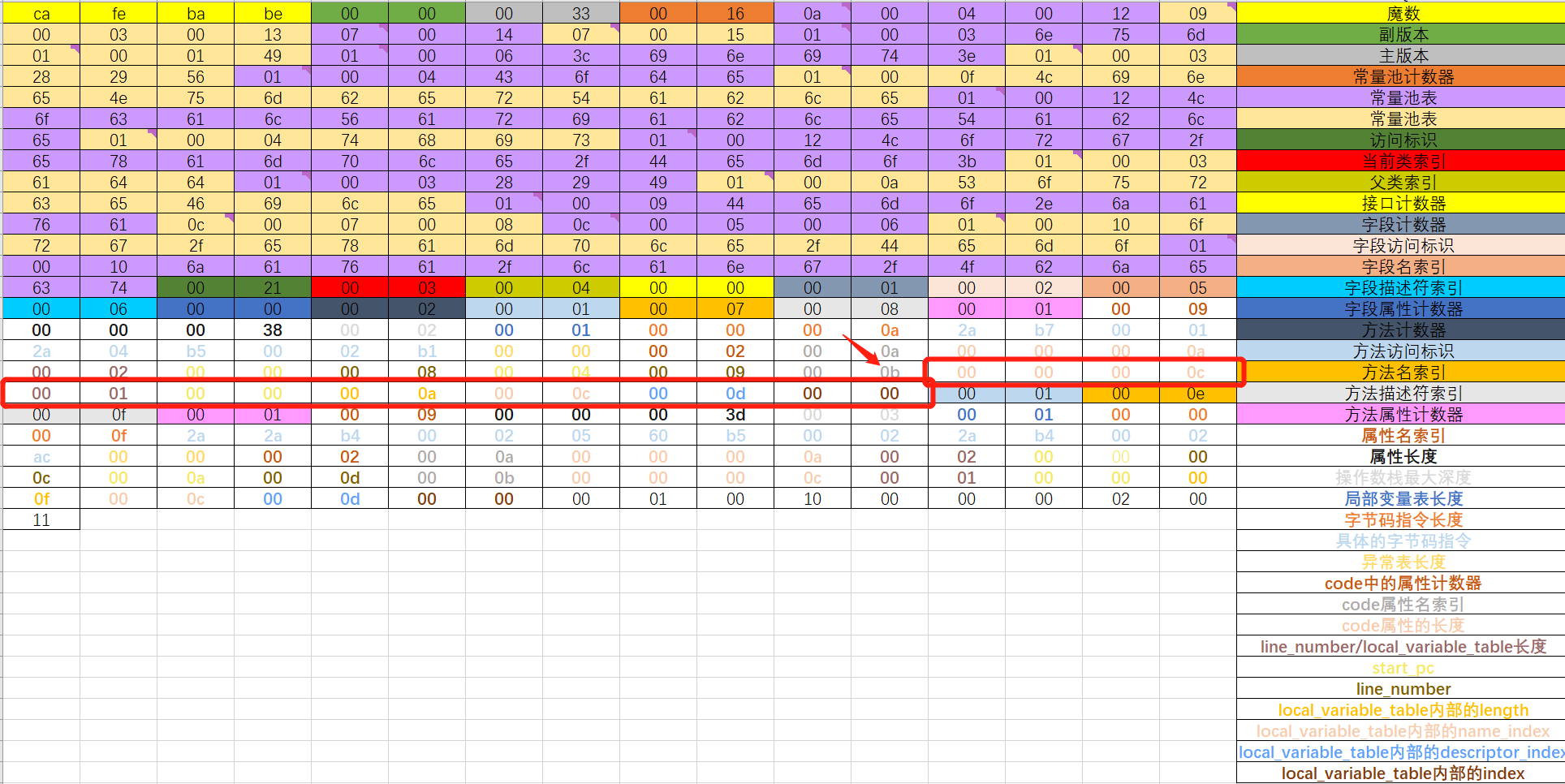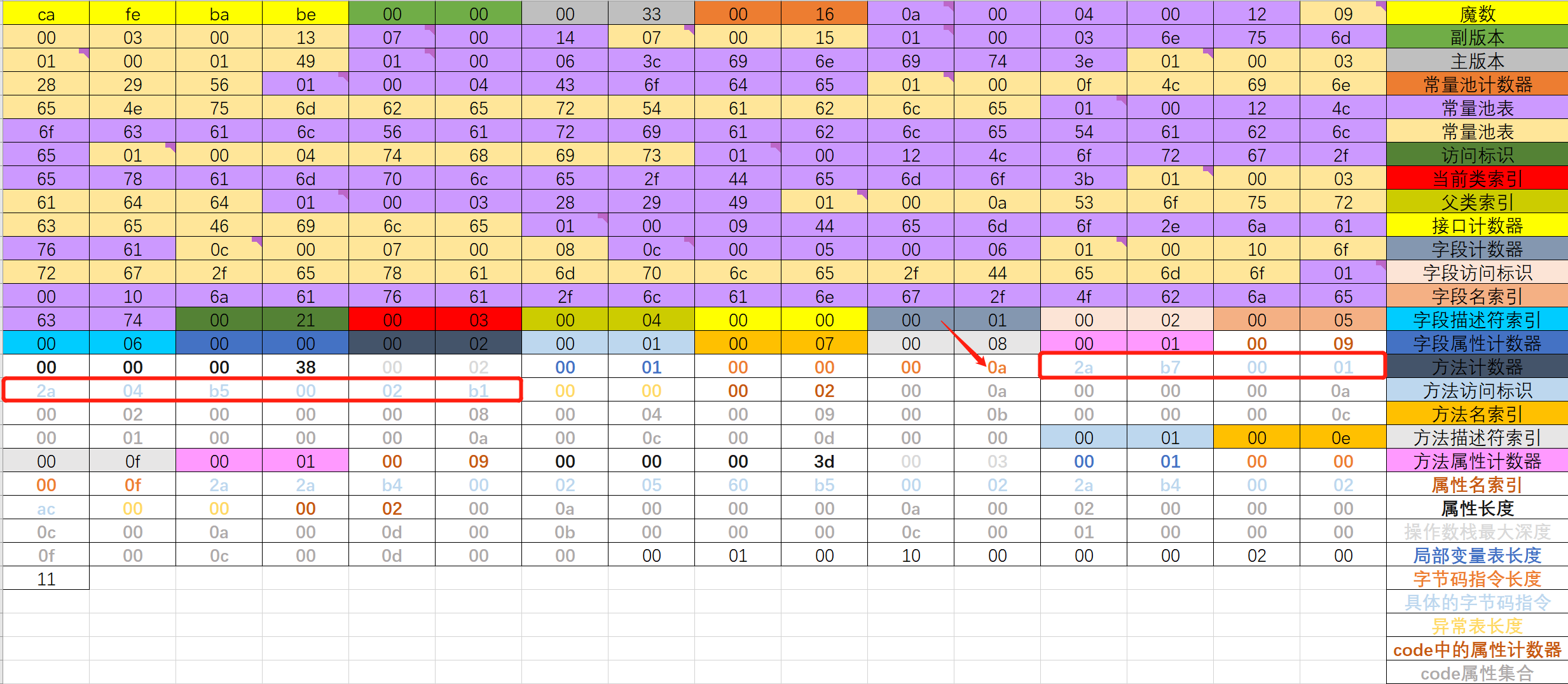 字节码指令的长度是00 00 00 0a,转换为十进制即为10,即该方法字节码指令的长度总共有10个字节,如下图所画区域: