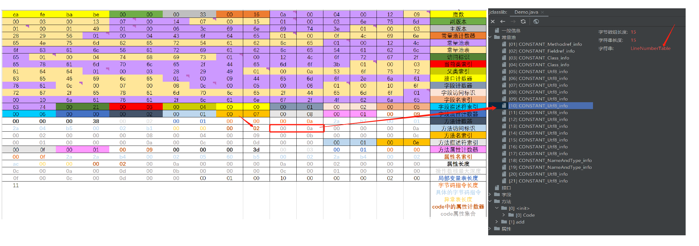 Code的属性计数器是00 02,即Code中也有2个属性集合,根据上面的属性通用格式可知紧接着的2个字节表示属性名索引,即00 0a对应LineNumberTable,LineNumberTable属性是用来描述Java源码行号与字节码行号之间的对应关系。这个属性可以用来在调试的时候定位代码执行的行数,start_pc,即字节码行号;line_number,即Java源代码行号。如图:
