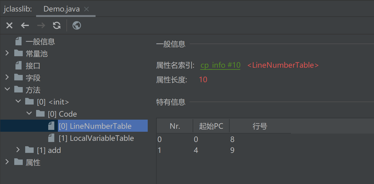 从而找到第一个方法(构造方法)对应的LineNumberTable属性表: