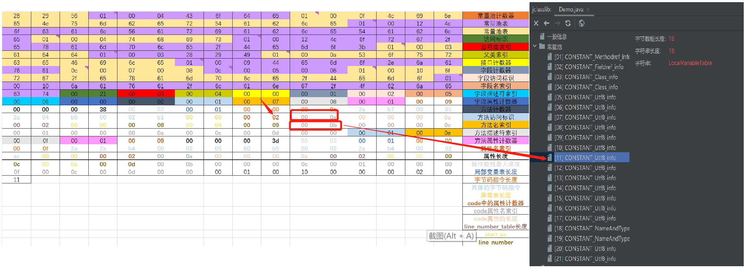 紧接着的2个字节表示Code的第二个属性集索引,即00 0b对应LocalVariableTable,如图: