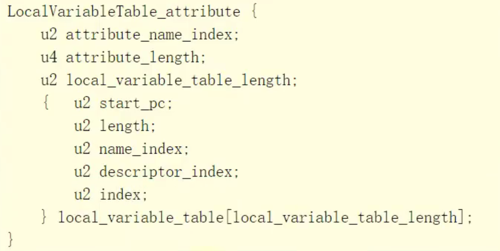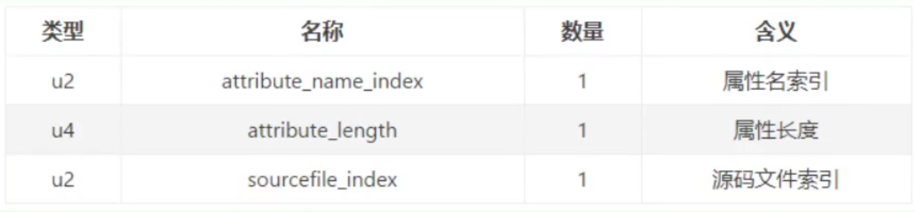 类型 名称 数量 含义 u2 attribute_name_index 1 属性名索引 u4 attribute_length 1 属性长度 u1 info attribute_length 属性表 - 即只需说明属性的名称以及占用位数的长度即可,属性表具体的结构可以去自定义。