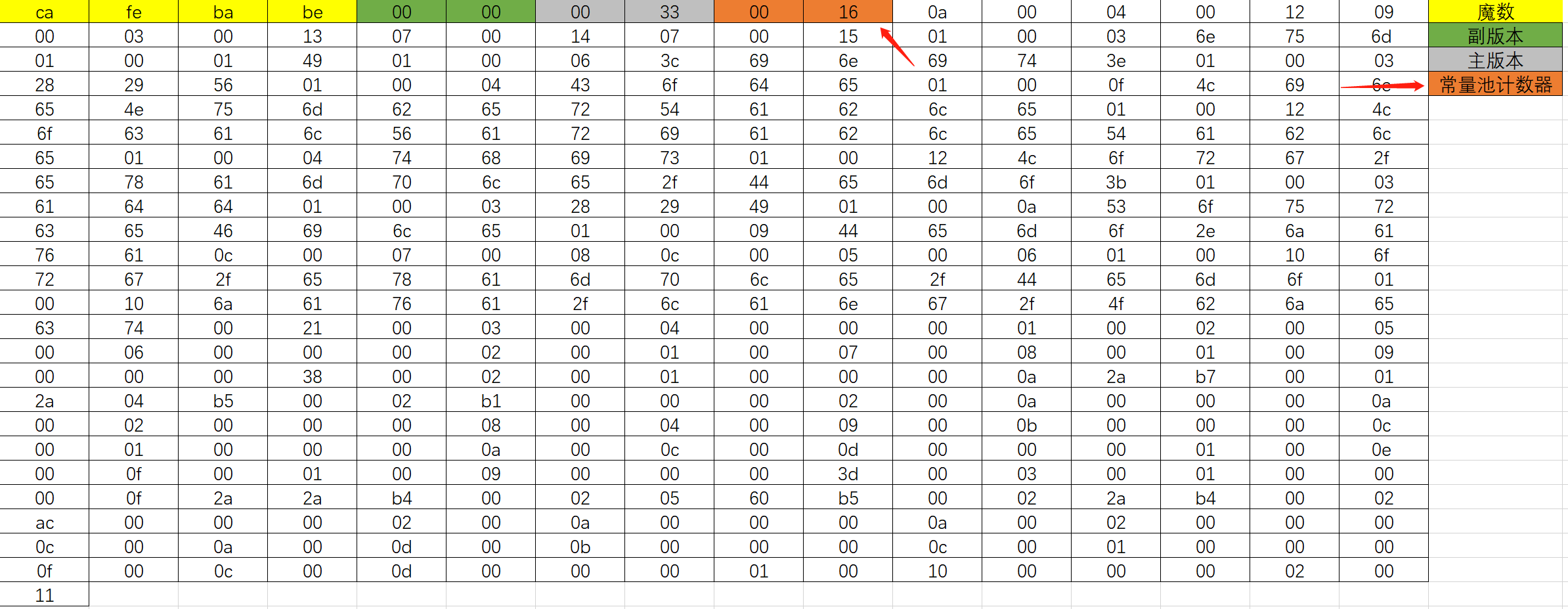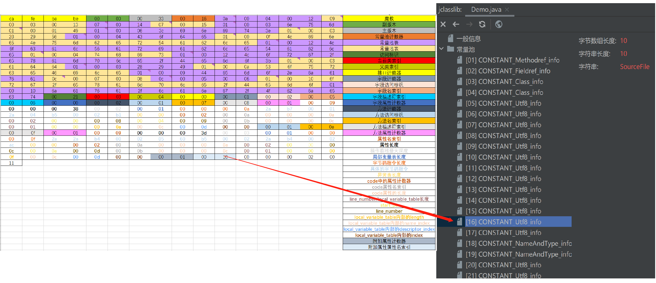 通过字节码文件可知常量池计数器有16,转换成10进制是22,而22-1=21,所以实际上常量池表有21项,通过查表得到下图:
