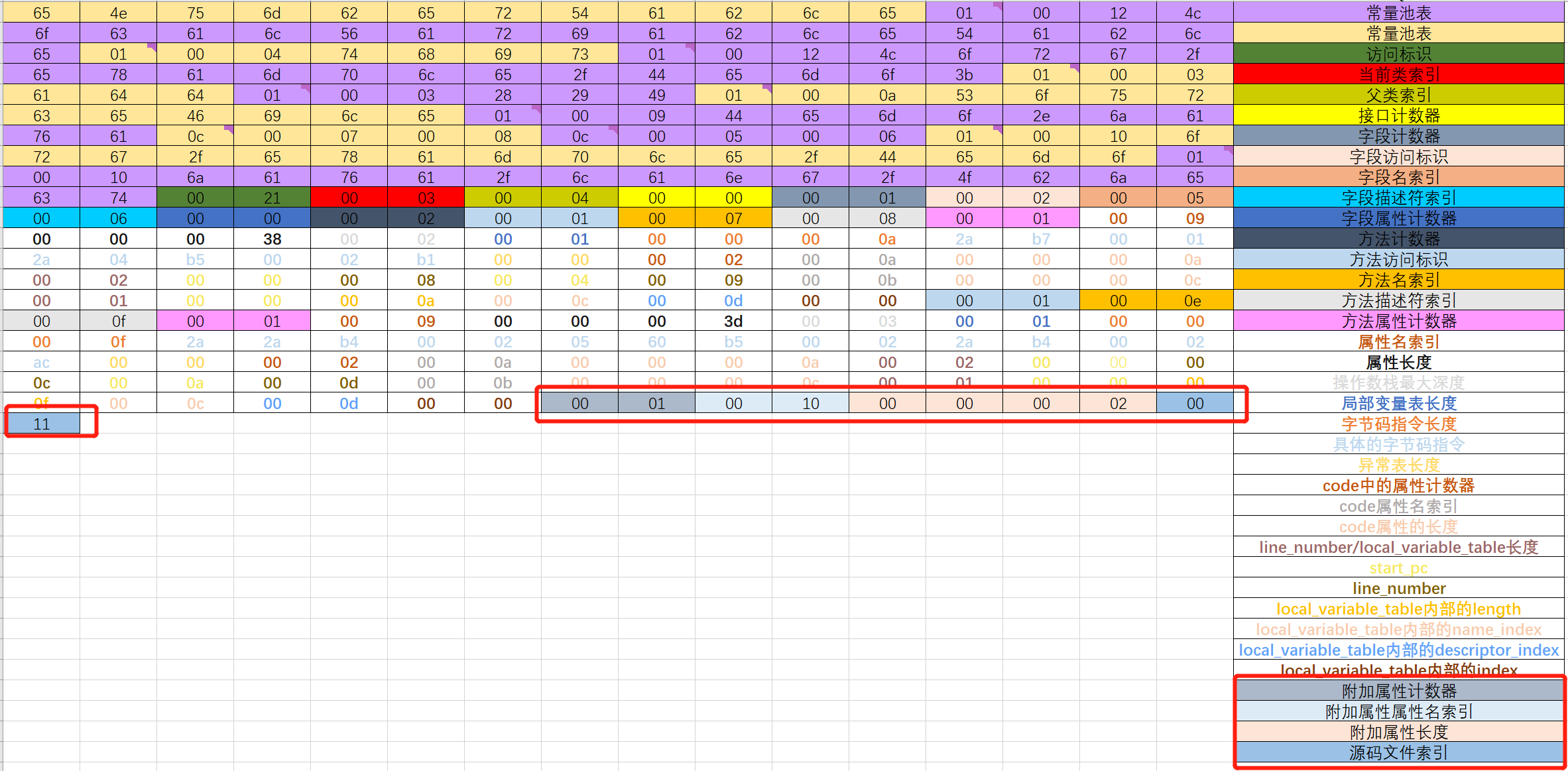 对应以下字节码指令如下,其中的附加属性长度永远固定为00 00 00 02,源码文件索引为00 11对应十进制的17,即源文件的文件名: