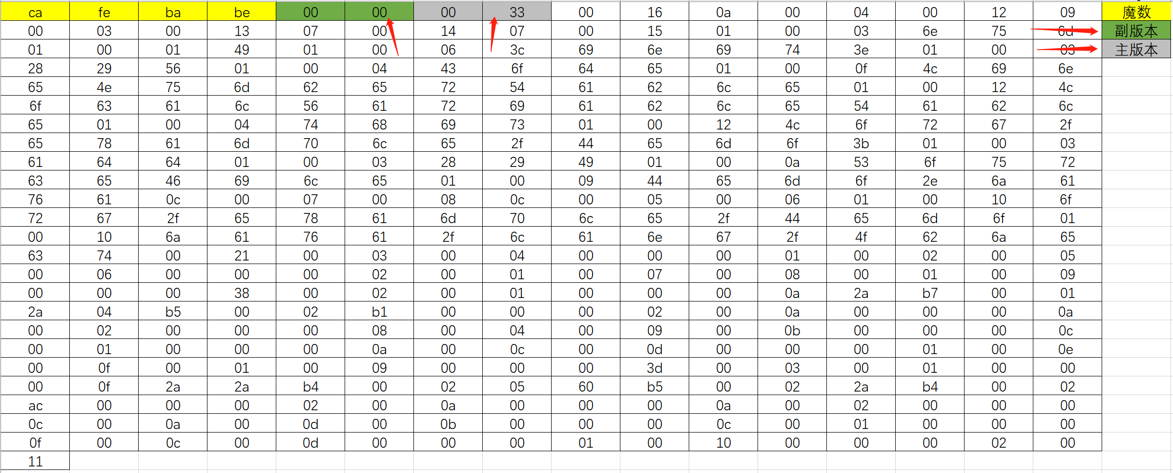 紧接着魔数的4个字节存储的是 Class文件的版本号。同样也是4个字节。第5个和第6个宇节所代表的含义就是编译的副版本号minor_version,而第7个和第8个字节就是编译的主版本号中major_version。