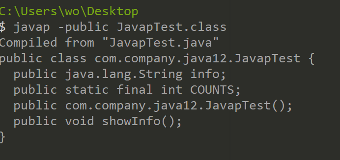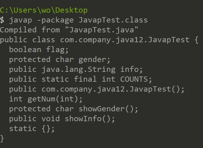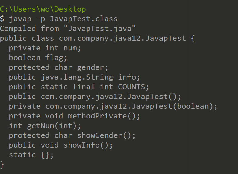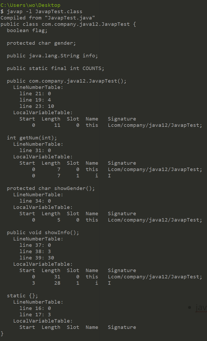 private void methodPrivate(); descriptor: ()V flags: ACC_PRIVATE Code: stack=0, locals=1, args_size=1 0: return LineNumberTable: line 29: 0 LocalVariableTable: Start Length Slot Name Signature 0 1 0 this Lcom/company/java12/JavapTest;