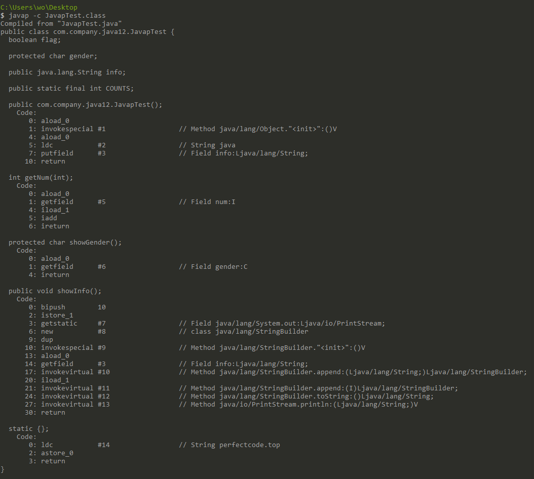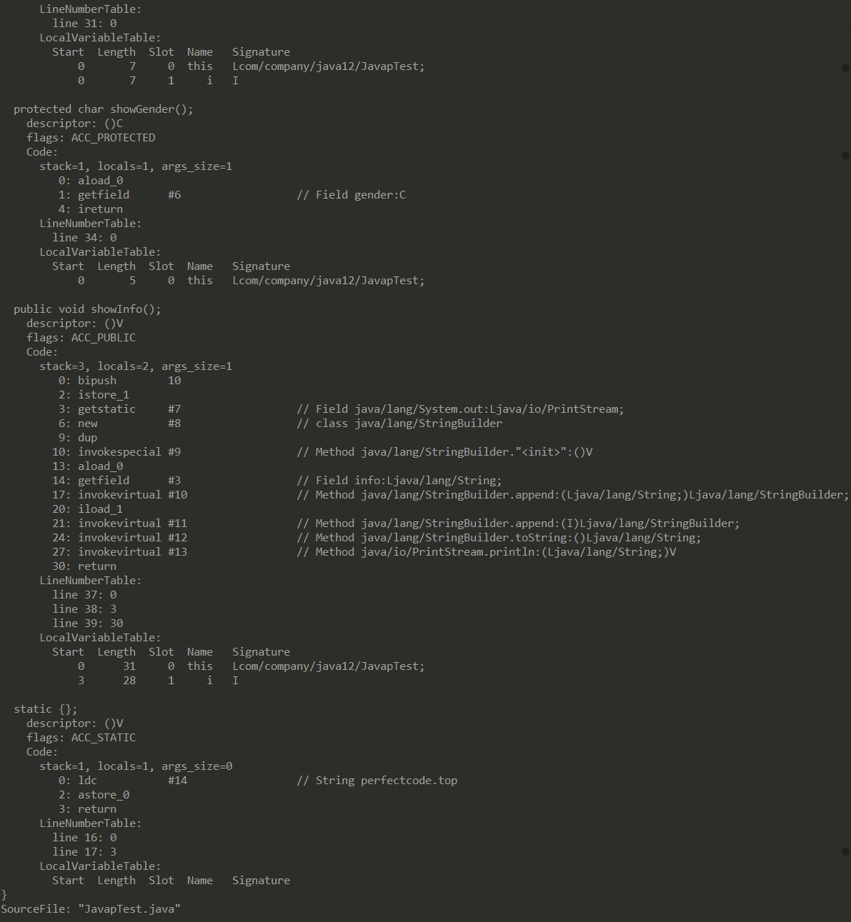 static {}; descriptor: ()V flags: ACC_STATIC Code: stack=1, locals=1, args_size=0 0: ldc #14 // String perfectcode.top 2: astore_0 3: return LineNumberTable: line 16: 0 line 17: 3 LocalVariableTable: Start Length Slot Name Signature } SourceFile: "JavapTest.java" //附加属性:指明当前字节码文件对应的源程序文件名