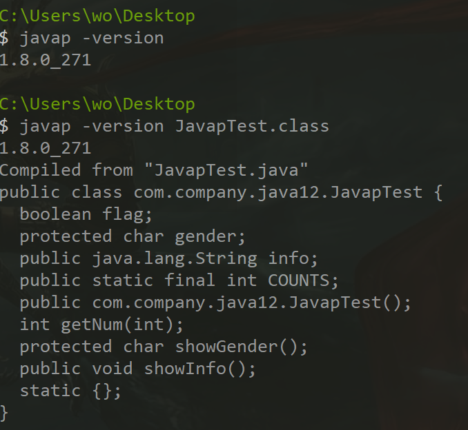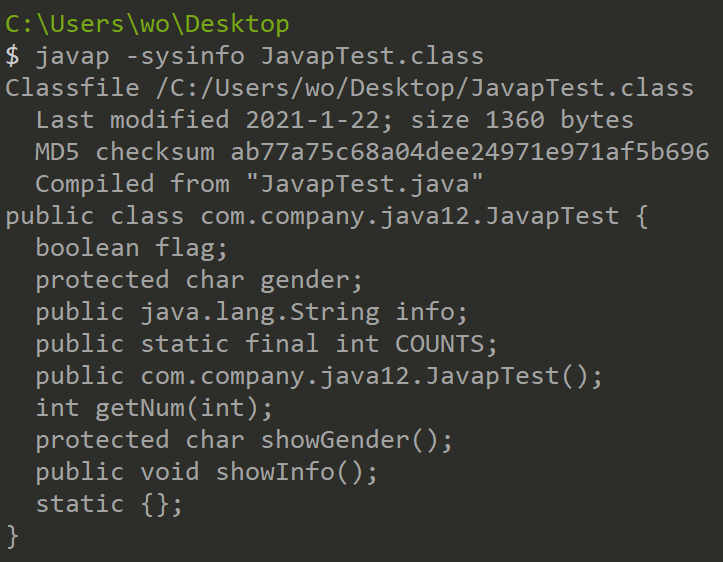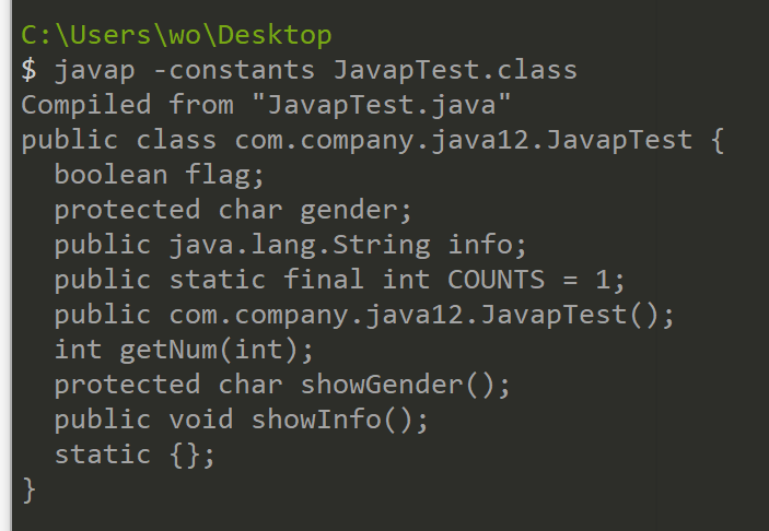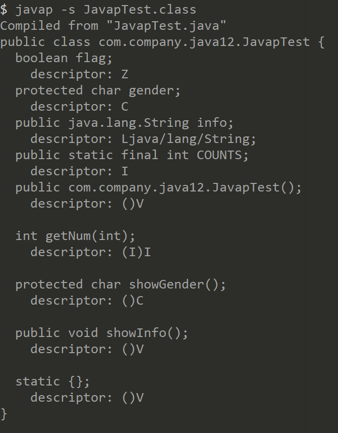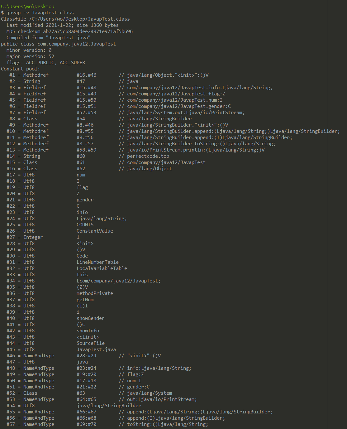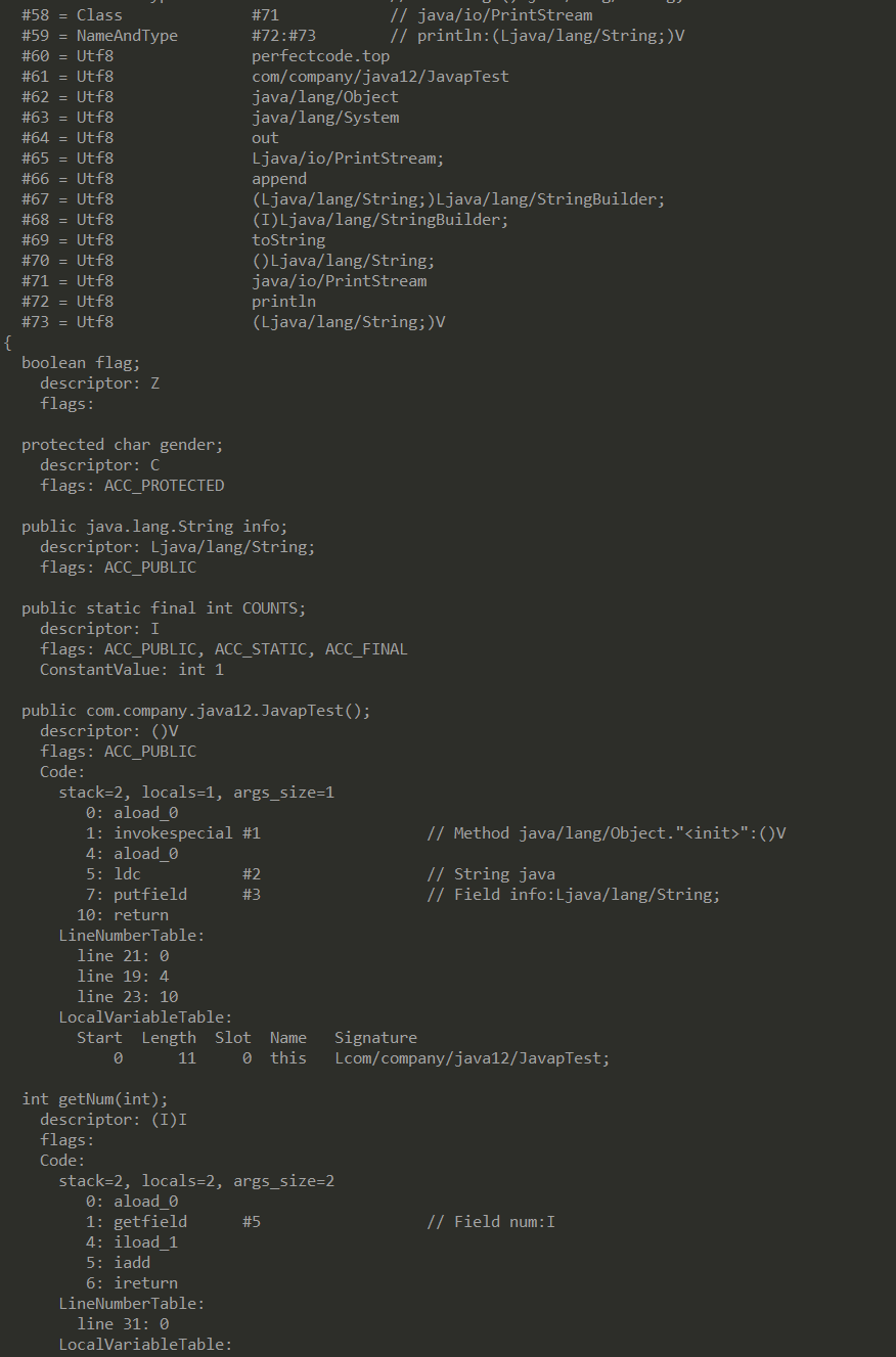 | Classfile /C:/Users/wo/Desktop/JavapTest.class //字节码文件所属的路径 Last modified 2021-1-22; size 1360 bytes //最后修改时间;字节码文件的大小 MD5 checksum ab77a75c68a04dee24971e971af5b696 //MD5散列值 Compiled from "JavapTest.java" //源文件的名称 public class com.company.java12.JavapTest minor version: 0 //副版本 major version: 52 //主版本 flags: ACC_PUBLIC, ACC_SUPER //访问标识 Constant pool: //常量池信息 #1 = Methodref #16.#46 // java/lang/Object."<init>":()V #2 = String #47 // java #3 = Fieldref #15.#48 // com/company/java12/JavapTest.info:Ljava/lang/String; #4 = Fieldref #15.#49 // com/company/java12/JavapTest.flag:Z #5 = Fieldref #15.#50 // com/company/java12/JavapTest.num:I #6 = Fieldref #15.#51 // com/company/java12/JavapTest.gender:C #7 = Fieldref #52.#53 // java/lang/System.out:Ljava/io/PrintStream; #8 = Class #54 // java/lang/StringBuilder #9 = Methodref #8.#46 // java/lang/StringBuilder."<init>":()V #10 = Methodref #8.#55 // java/lang/StringBuilder.append:(Ljava/lang/String;)Ljava/lang/StringBuilder; #11 = Methodref #8.#56 // java/lang/StringBuilder.append:(I)Ljava/lang/StringBuilder; #12 = Methodref #8.#57 // java/lang/StringBuilder.toString:()Ljava/lang/String; #13 = Methodref #58.#59 // java/io/PrintStream.println:(Ljava/lang/String;)V #14 = String #60 // perfectcode.top #15 = Class #61 // com/company/java12/JavapTest #16 = Class #62 // java/lang/Object #17 = Utf8 num #18 = Utf8 I #19 = Utf8 flag #20 = Utf8 Z #21 = Utf8 gender #22 = Utf8 C #23 = Utf8 info #24 = Utf8 Ljava/lang/String; #25 = Utf8 COUNTS #26 = Utf8 ConstantValue #27 = Integer 1 #28 = Utf8 <init> #29 = Utf8 ()V #30 = Utf8 Code #31 = Utf8 LineNumberTable #32 = Utf8 LocalVariableTable #33 = Utf8 this #34 = Utf8 Lcom/company/java12/JavapTest; #35 = Utf8 (Z)V #36 = Utf8 methodPrivate #37 = Utf8 getNum #38 = Utf8 (I)I #39 = Utf8 i #40 = Utf8 showGender #41 = Utf8 ()C #42 = Utf8 showInfo #43 = Utf8 <clinit> #44 = Utf8 SourceFile #45 = Utf8 JavapTest.java #46 = NameAndType #28:#29 // "<init>":()V #47 = Utf8 java #48 = NameAndType #23:#24 // info:Ljava/lang/String; #49 = NameAndType #19:#20 // flag:Z #50 = NameAndType #17:#18 // num:I #51 = NameAndType #21:#22 // gender:C #52 = Class #63 // java/lang/System #53 = NameAndType #64:#65 // out:Ljava/io/PrintStream; #54 = Utf8 java/lang/StringBuilder #55 = NameAndType #66:#67 // append:(Ljava/lang/String;)Ljava/lang/StringBuilder; #56 = NameAndType #66:#68 // append:(I)Ljava/lang/StringBuilder; #57 = NameAndType #69:#70 // toString:()Ljava/lang/String; #58 = Class #71 // java/io/PrintStream #59 = NameAndType #72:#73 // println:(Ljava/lang/String;)V #60 = Utf8 perfectcode.top #61 = Utf8 com/company/java12/JavapTest #62 = Utf8 java/lang/Object #63 = Utf8 java/lang/System #64 = Utf8 out #65 = Utf8 Ljava/io/PrintStream; #66 = Utf8 append #67 = Utf8 (Ljava/lang/String;)Ljava/lang/StringBuilder; #68 = Utf8 (I)Ljava/lang/StringBuilder; #69 = Utf8 toString #70 = Utf8 ()Ljava/lang/String; #71 = Utf8 java/io/PrintStream #72 = Utf8 println #73 = Utf8 (Ljava/lang/String;)V { //字段表集合的信息 private int num; //字段名 descriptor: I //字段描述符:字段的类型 flags: ACC_PRIVATE //字段的访问标识