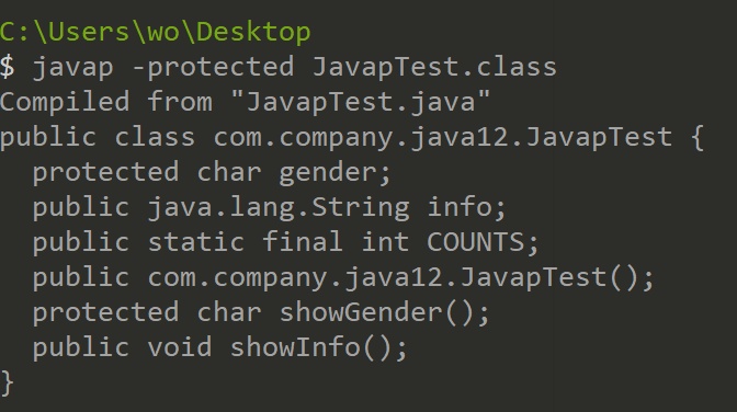 protected char showGender(); descriptor: ()C flags: ACC_PROTECTED Code: stack=1, locals=1, args_size=1 0: aload_0 1: getfield #6 // Field gender:C 4: ireturn LineNumberTable: line 34: 0 LocalVariableTable: Start Length Slot Name Signature 0 5 0 this Lcom/company/java12/JavapTest;