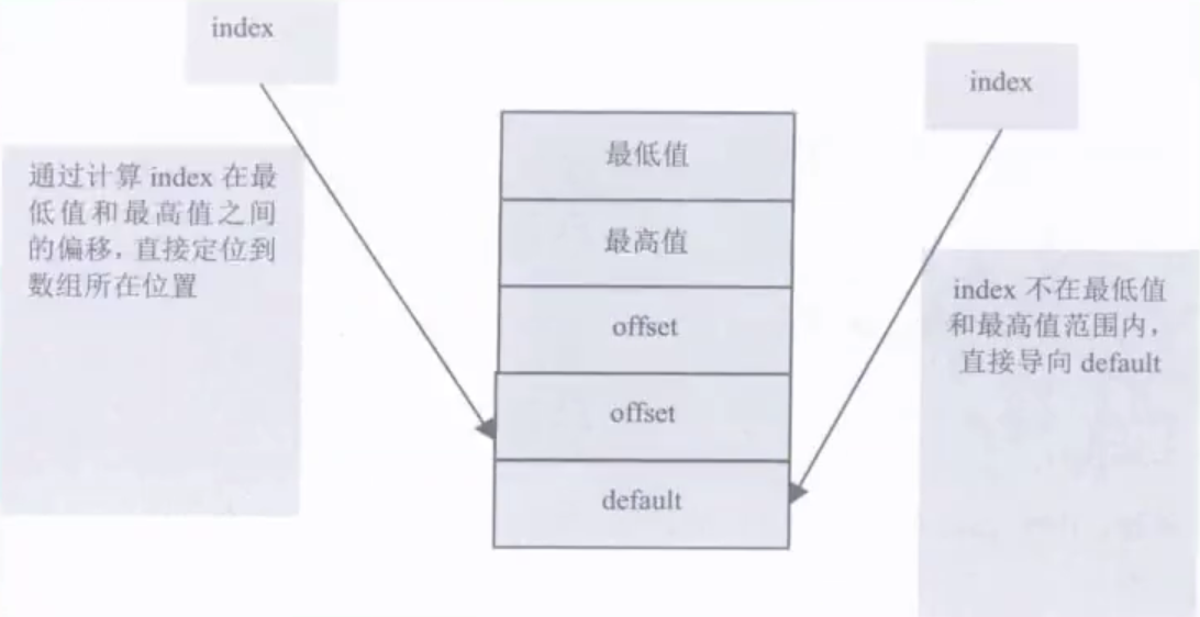| 0 iload_1 1 tableswitch 1 to 3 1: 28 (+27) //直接利用最高最低和偏移量定位 2: 34 (+33) 3: 37 (+36) default: 43 (+42) 28 bipush 10 30 istore_2 31 goto 46 (+15) 34 bipush 20 36 istore_2 37 bipush 30 39 istore_2 40 goto 46 (+6) 43 bipush 40 45 istore_2 46 return